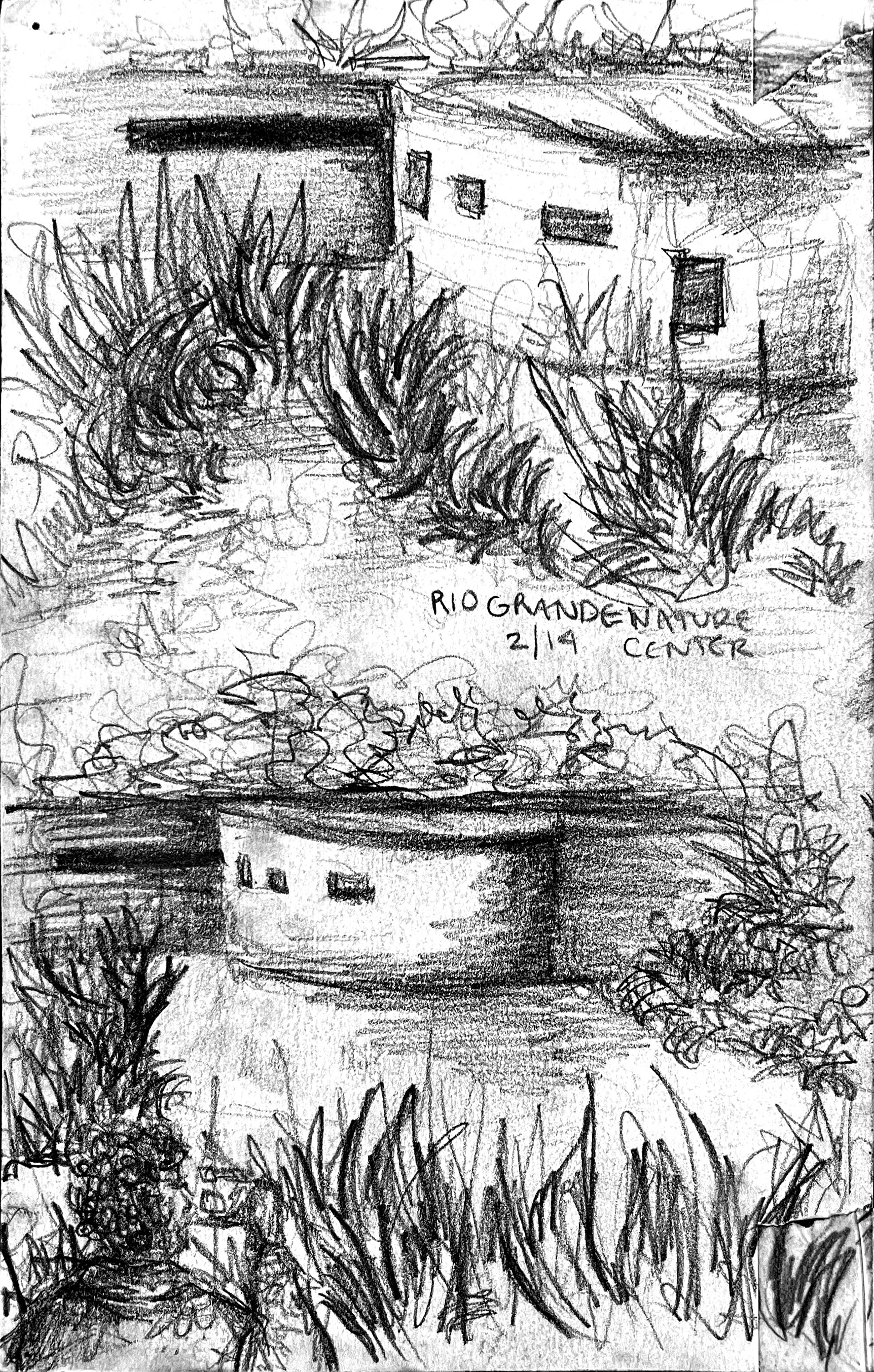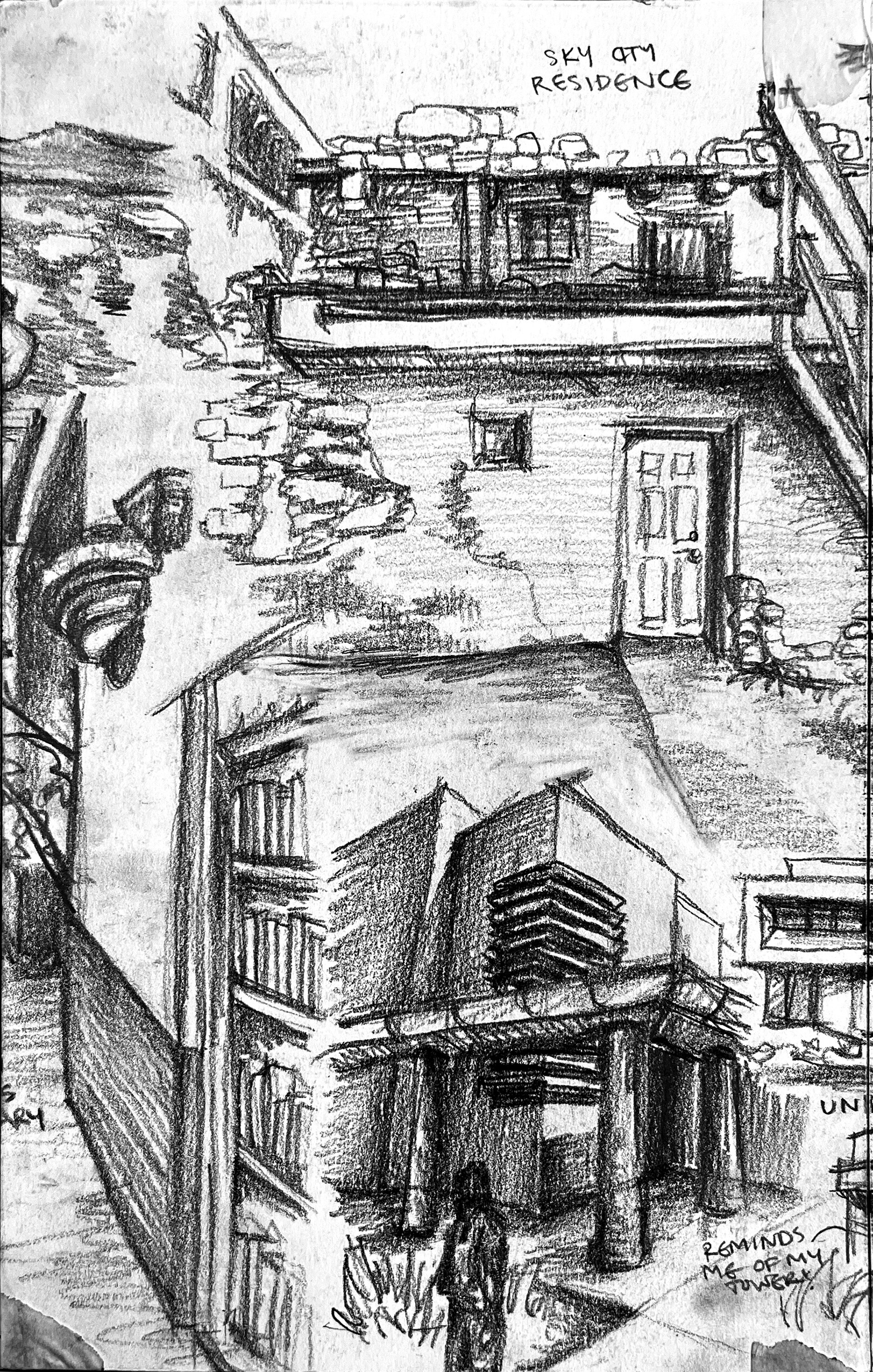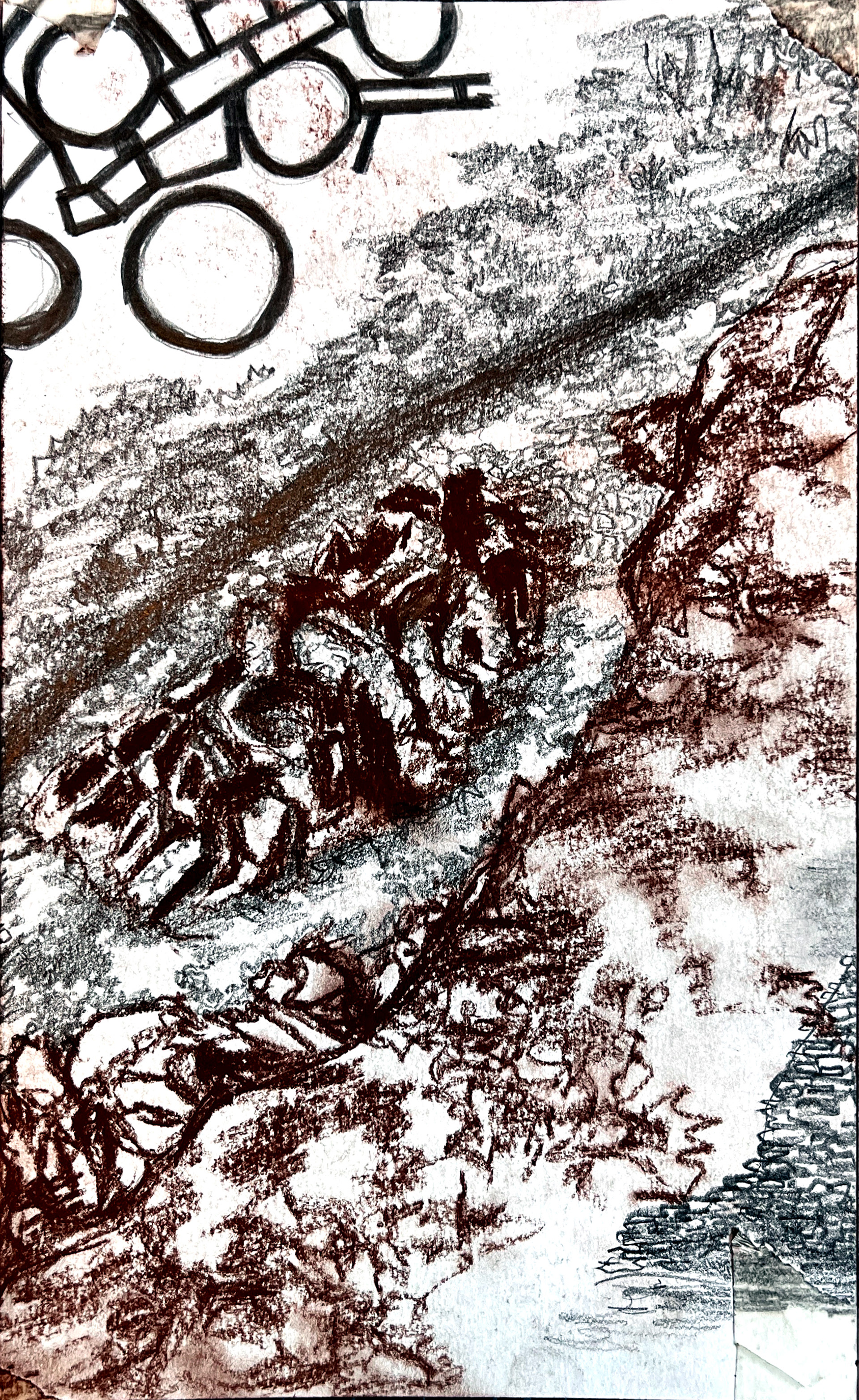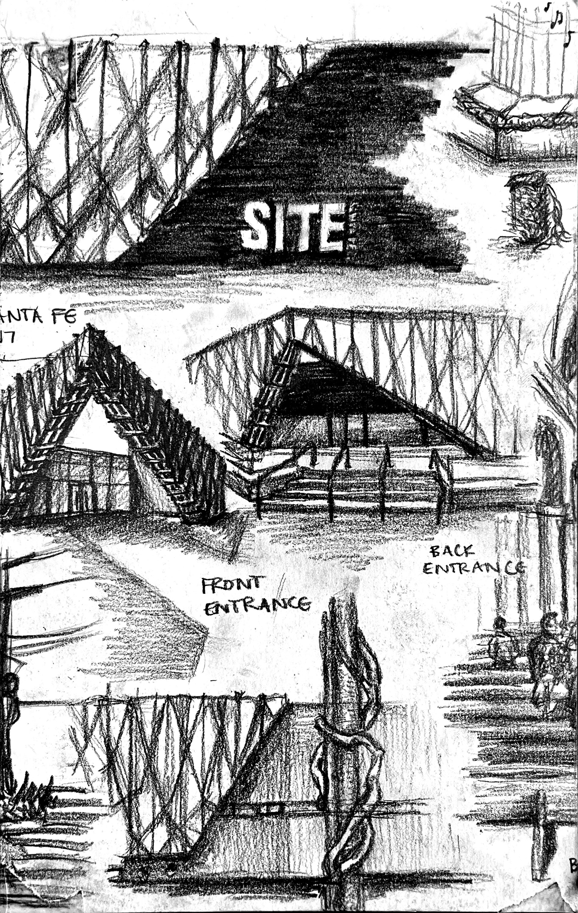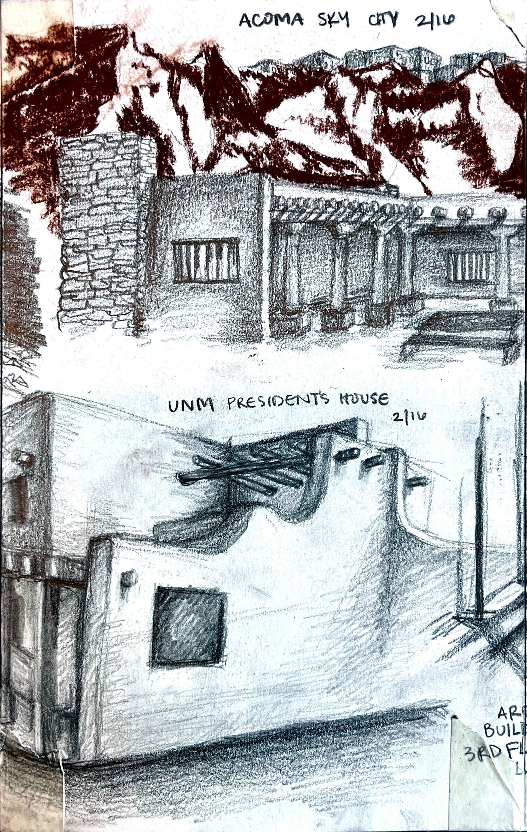 Sketchbook. Home for analysis. My goals were to document the experiential and technical aspects of a space, people interacting with the studied space, and to tell a story as a result. Used to depict light and shadow and solid-void relationships, the materials used were woodless graphite pencils and conte crayons.